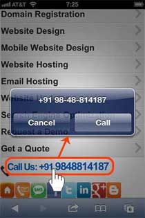 Any feature that makes easy to be in touch with you brings more customers. Tap-to-Call feature in your mobile website makes it easy for your customers to call you. Unlike desktop version of the website where visitor needs to lookup on your website and dial from a telephone or cellphone, they can simply tap on your phone number on your mobile website which will dial your phone number with confirmation. No need to type or remember your phone number. We can place the Tap-to-Call feature button in contact us page and on all pages prominently in order to encourage prospective customers/clients to contact you. You can see in picture shown here how tapping on the telephone number is prompting to confirm before dialing automatically. | ![]() |